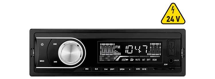 Магнитола 1 Din для коммерческого транспорта с напряжением 24 Вольт с USB/SD, входом AUX, радио и RCA разъемом.